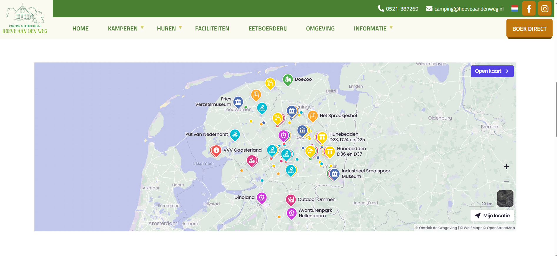 De kaart biedt een duidelijk overzicht van bezienswaardigheden, wandelroutes en leuke uitstapjes in de buurt. Uniek aan onze kaart is dat er geen andere accommodaties of activiteiten op andere recreatiebedrijven worden weergegeven. Zo houdt u de aandacht van uw websitebezoekers bij uw eigen locatie, zonder dat u bezoekers onbedoeld bij een collega-ondernemer op de website komt.